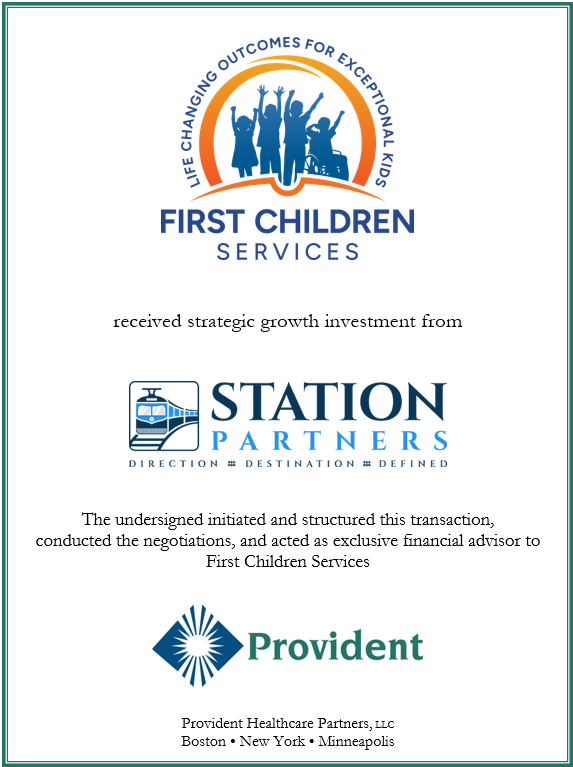 Provident Healthcare Partners (“Provident”), a leading healthcare investment banking firm, announced it has advised First Children Services (“FCS”) on securing a strategic growth investment from Station Partners (“Station”) to support the company’s continued expansion. FCS is a leading provider of center-, home- and school-based behavioral health and special education services to children and adolescents throughout New Jersey and Pennsylvania.