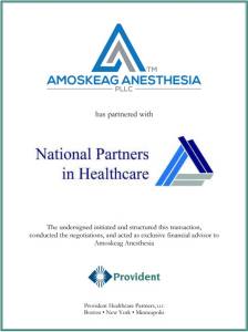 Provident Healthcare Partners (“Provident”), a leading healthcare investment banking firm, announced it has advised Amoskeag Anesthesia (“Amoskeag”) in its partnership with National Partners in Healthcare (“NPH”). Amoskeag provides state-of-the-art anesthetic care and interventional pain management at 11 hospitals and ASCs throughout New Hampshire. The group consists of more than 90 providers including Board Certified Anesthesiologists, Pain Interventionalists, Certified Registered Nurse Anesthetists, and Nurse Practitioners.