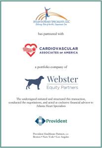 Provident Healthcare Partners (“Provident”), a leading healthcare investment banking firm, announced it has advised Atlanta Heart Specialists (“AHS”) in its partnership with Cardiovascular Associates of America, a portfolio company of Webster Equity Partners. AHS provides general, diagnostic, and interventional cardiology services throughout its eight locations and two vascular labs in the Greater Atlanta market. AHS’ provider base includes fifteen cardiologists, six mid-level providers, and one podiatrist.