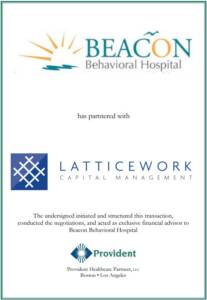 Rebecca Leiba, Managing Director of President of Provident Healthcare Partners stated, “Beacon’s new partnership with Latticework will allow Sean and the Beacon team to continue growing their market leading platform into new states and new service offerings.” He added, “It was a pleasure working with the entire Beacon team and there is no doubt in my mind that Beacon Behavioral Hospital and Latticework are about to make a giant splash in the market.”