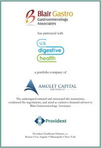 Provident Healthcare Partners (“Provident”), a leading healthcare investment banking firm, announced it has advised Blair Gastroenterology Associates (“BGA”) in its partnership with US Digestive Health (“USDH”), backed by Amulet Capital. BGA’s seven physicians and 14 APPs provide a full range of gastroenterology services through its two office locations and surgery center in central Pennsylvania.