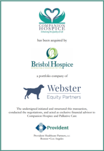 Companion Hospice (“Companion”), a leading hospice and palliative care provider in the Western United States, has had its California operations acquired by Bristol Hospice, a portfolio company of Webster Equity Partners. Companion delivers hospice and palliative care services to over 600 active patients daily in Southern California and is among one of the largest independent providers in the market. The terms of the transaction were not disclosed.