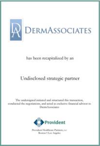 DermAssociates, PC (DermAssociates) has completed a recapitalization with an undisclosed strategic partner. DermAssociates is a comprehensive provider of medical, surgical, and cosmetic dermatologic care to patients at its two locations in Rockville and Silver Spring, Maryland. Provident Healthcare Partners (Provident) served as exclusive financial advisor to DermAssociates. The terms of the transaction were not disclosed.