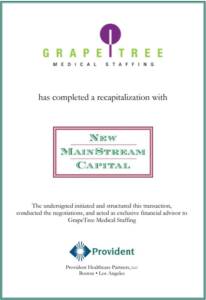 GrapeTree Medical Staffing (“GrapeTree”), one of the fastest growing and largest nurse staffing providers in the Midwest, has completed a recapitalization with New MainStream Capital (“NMS”). GrapeTree’s service offering includes CNA staffing in nursing homes and assisted living facilities, as well as LPNs and RNs in hospitals. GrapeTree will serve as the platform investment in NMS’ effort to build an industry-leading provider of CNA and RN staffing to long-term care facilities and hospitals on both a per diem and contract basis.