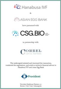 “This transaction highlights the continued demand for specialized fertility platforms,” said Vesely. “Hanabusa IVF’s differentiated mini-IVF clinical model and Asian Egg Bank’s specialization in serving Asian patients creates a unique offering in the fertility market. We are pleased to have advised the team on this partnership with CSG.BIO and Corbel and look forward to following the platform’s continued growth.”