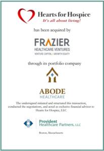 “The owners of Hearts for Hospice have built a very strong and efficiently run hospice and home health company through a commitment to their patients and families they serve. Now, through this acquisition, Abode and Frazier will provide Hearts for Hospice with the resources it needs to maintain its focus on providing quality care while also achieving substantial growth,” commented Justin Hand, Managing Director at Provident Healthcare Partners.