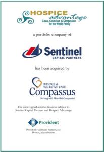 Robert Ciardi, Managing Partner of Provident, commented, “Our relationship with Hospice Advantage dates back to 2012 when we represented the organization through a process and ultimate recapitalization with Sentinel Capital Partners. We are thrilled at the success that Hospice Advantage has had over the past three years under the guidance and stewardship of Sentinel and expect the relationship with Compassus to only further their mission of providing superior care to end-of -life patients”.