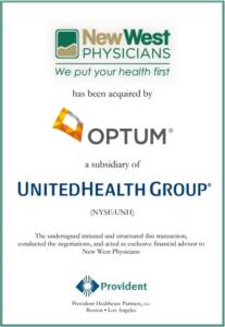 New West Physicians, PC (New West) has been acquired by Optum, Inc. (Optum), a subsidiary of UnitedHealth Group (NYSE: UNH). New West, one of the largest physician practices in the Denver area, provides primary care services to over 200,000 patients through 120 healthcare providers. Best known for their population health initiatives, the New West team has developed a model that caters towards the complete continuum of care for patients which earned the organization the American Medical Group Association Acclaim Award in 2015. Provident Healthcare Partners served as exclusive financial advisor to New West.