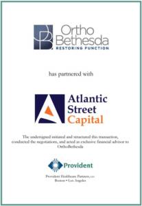 OrthoBethesda, a premier provider of orthopedic services in the greater Washington, DC region, has partnered with Atlantic Street Capital to create a dynamic orthopedic practice. OrthoBethesda operates four Centers of Excellence: Washington Joint Institute, providing treatment to patients with debilitating arthritic joint conditions; Washington Shoulder Institute, focusing on the demands of patients suffering from various shoulder-related ailments; Washington Spine and Scoliosis Institute, offering state of the art management of complex spinal conditions; and OrthoTraumaBethesda, providing advanced comprehensive care of orthopedic trauma cases. Provident Healthcare Partners (“Provident”) served as exclusive financial advisor to OrthoBethesda. The terms of the transaction were not disclosed.