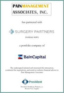 Pain Management Associates, Inc. and Interventional Spine Center, Inc. (collectively referred to as “Pain Management Associates” or “PMA”), have partnered with Surgery Partners, a portfolio company of Bain Capital. PMA is the leading provider of premium interventional pain management in Orange County, California and the surrounding communities. Provident Healthcare Partners (“Provident”) served as exclusive financial advisor to Pain Management Associates. The terms of the transaction were not disclosed.