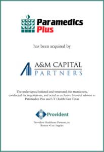 Paramedics Plus, LLC has been acquired by A&M Capital Partners, LP to form Paramedics Logistics Operating Company, LLC (Paramedics Logistics). Paramedics Logistics was acquired from previous owner UT Health, formerly known as East Texas Medical Center Regional Healthcare System. The transition of Paramedics Logistics to the new ownership is expected to create new growth opportunities for its employees while continuing to deliver service and innovation for the patients and communities where they live and work. Provident Healthcare Partners (“Provident”) served as exclusive financial advisor to Paramedics Plus and UT Health East Texas. The terms of the transaction were not disclosed.