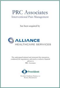 PRC Associates, LLC (PRC) has been acquired by Alliance HealthCare Services (Alliance). PRC is an interventional pain management (IPM) practice headquartered in Daytona Beach, Florida and currently has seven locations. Provident Healthcare Partners served as exclusive financial advisor to PRC. The terms of the transaction were not disclosed.
