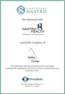 Southeast Gastro, a Birmingham Alabama-based gastroenterology practice with 20 board-certified gastroenterologists, 17 advanced practitioners, 8 locations, and three surgery centers, has partnered with Gastro Health, a leading medical group specializing in digestive health. Provident Healthcare Partners (“Provident”) served as exclusive financial advisor to Southeast Gastro. The terms of the transaction were not disclosed.
