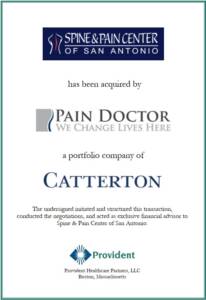 Spine & Pain Center of San Antonio (SPCSA) has been acquired by Pain Doctor, a portfolio company of Catterton Partners.  Spine & Pain Center of San Antonio is an interventional pain management (IPM) physician group practice dedicated to improving its patients’ quality of life by directly treating pain and improving spine movement and functions.  Provident Healthcare Partners served as exclusive financial advisor to SPCSA.  The terms of the transaction were not disclosed.