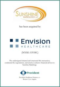 In discussing this transaction, Provident Healthcare Partners’ Michael Mahoney stated, “It was an absolute pleasure to represent Sunshine Radiology through this process. The organization has established an impeccable reputation for providing high-quality radiology services to its hospital partners within the Florida Hospital System, and with Envision Healthcare, Sunshine’s physicians and management team have found a partner that will help the group continue to thrive as interpretation volumes grow.”