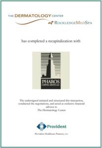 The Dermatology Center, P.A. (The Dermatology Center) has completed a recapitalization with Pharos Capital Group, LLC (Pharos). The Dermatology Center is a leading medical and cosmetic dermatology practice with four locations in the metro Washington D.C. area. The Company prides itself on offering the most comprehensive dermatology services in the area. Provident Healthcare Partners served as exclusive financial advisor to The Dermatology Center. The terms of the transaction were not disclosed.