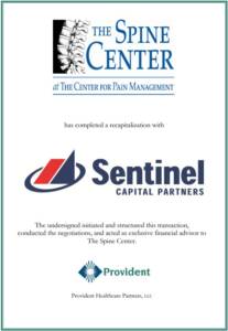 “The partnership with Sentinel Capital Partners will allow The Spine Center to accelerate its growth to continue serving those who suffer from chronic spinal and back pain. With the group’s focus on utilizing minimally-invasive procedures in a lower-cost ambulatory setting, The Spine Center is well-positioned to continue its growth as a market leader focused on providing quality care,” noted William Tao, Senior Analyst at Provident Healthcare Partners.