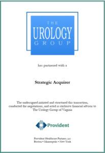 Provident is a leading healthcare investment banking firm specializing in merger and acquisition advisory, strategic planning, and capital formation services for healthcare companies. The firm has a comprehensive knowledge of market sectors and specialties, including urology. Provident also has unsurpassed experience and insight into the M&A process, which includes working with a multitude of investors such as private equity firms and strategic consolidators. For additional information, visit www.providenthp.com or follow on LinkedIn.
